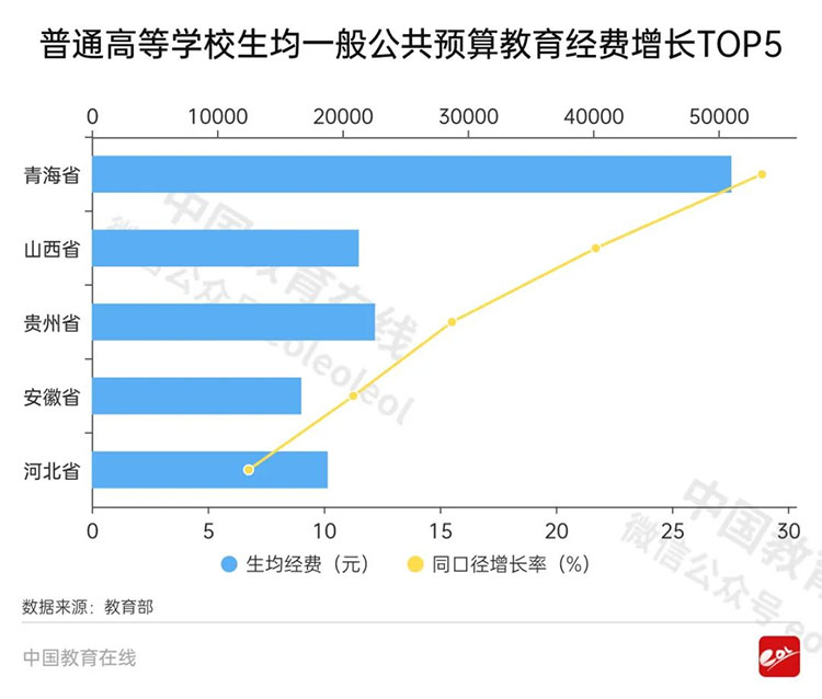 普通高校階段,大學(xué)生生均經(jīng)費(fèi)為22586.42元,同口徑比上年增長1.65%。增長最快的是青海省(28.88%)。其次為山西省(21.72%)、貴州省(15.52%)、安徽省(11.27%)、河北省(6.76%)。