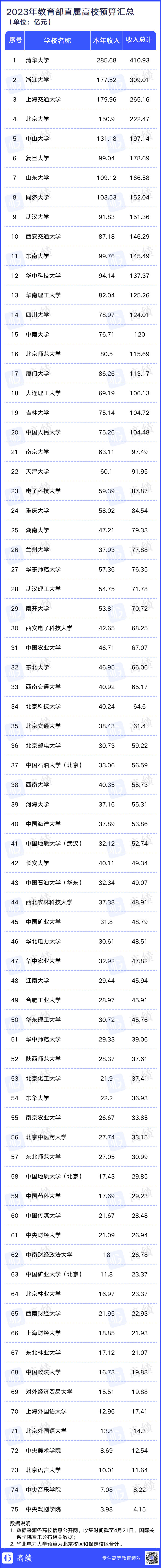 其中,清華大學首次突破400億,以410.93億元的年度預算,位居教育部直屬高校之首;排名第二的是浙江大學,突破了300億大關(guān),年度預算為309.01億元;上海交通大學則以265.47億元的年度預算,位居第三;北京大學以222.47億元,位居第四。這4所高校2023年度預算均在200億元以上。
