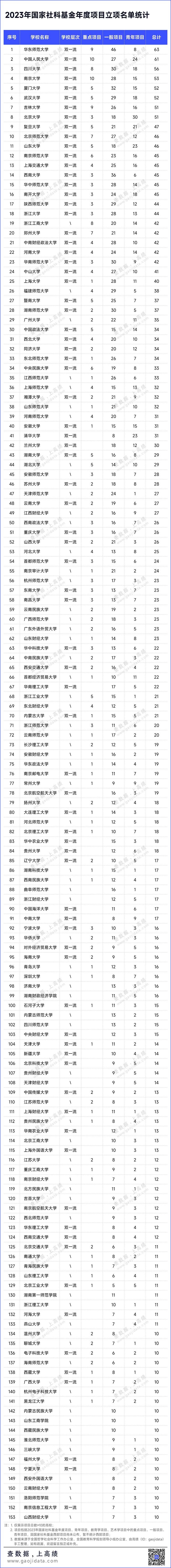 國(guó)家社科基金項(xiàng)目是目前我國(guó)唯一的國(guó)家級(jí)人文社科類研究項(xiàng)目,代表了人文社會(huì)科學(xué)的國(guó)家水準(zhǔn),是衡量一個(gè)單位科研生產(chǎn)力的重要指標(biāo)。下面匯總了2023年國(guó)家社科基金年度項(xiàng)目、青年項(xiàng)目和教育學(xué)、藝術(shù)學(xué)兩個(gè)單列學(xué)科項(xiàng)目,一起來看看誰是人文社科領(lǐng)域的領(lǐng)頭羊。