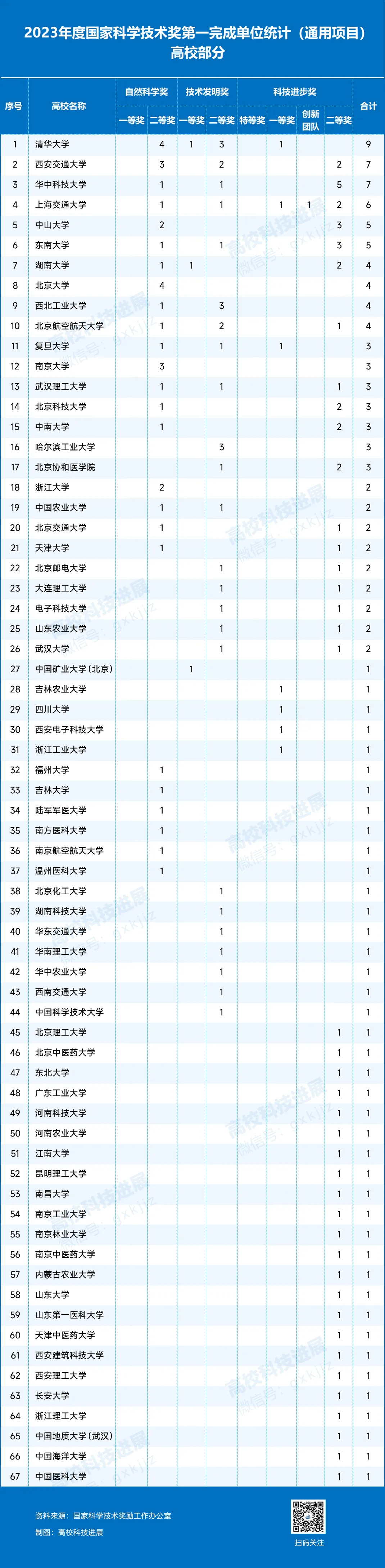 據(jù)統(tǒng)計(jì),在通用項(xiàng)目中,以高校為第一完成單位(含高校醫(yī)學(xué)院/部、附屬醫(yī)院、研究所等直屬機(jī)構(gòu))的通用項(xiàng)目共計(jì)134項(xiàng)。國(guó)家自然科學(xué)獎(jiǎng)項(xiàng)目中,清華大學(xué)、北京大學(xué)均有4項(xiàng)獲評(píng)二等獎(jiǎng),西安交通大學(xué)、南京大學(xué)均有3項(xiàng)獲評(píng)二等獎(jiǎng);國(guó)家技術(shù)發(fā)明獎(jiǎng)項(xiàng)目中,清華大學(xué)、湖南大學(xué)、中國(guó)礦業(yè)大學(xué)(北京)各有1項(xiàng)獲評(píng)一等獎(jiǎng);國(guó)家科學(xué)技術(shù)進(jìn)步獎(jiǎng)項(xiàng)目中,清華大學(xué)、上海交通大學(xué)、復(fù)旦大學(xué)、吉林農(nóng)業(yè)大學(xué)、四川大學(xué)、西安電子科技大學(xué)、浙江工業(yè)大學(xué)各有1項(xiàng)獲評(píng)一等獎(jiǎng)。