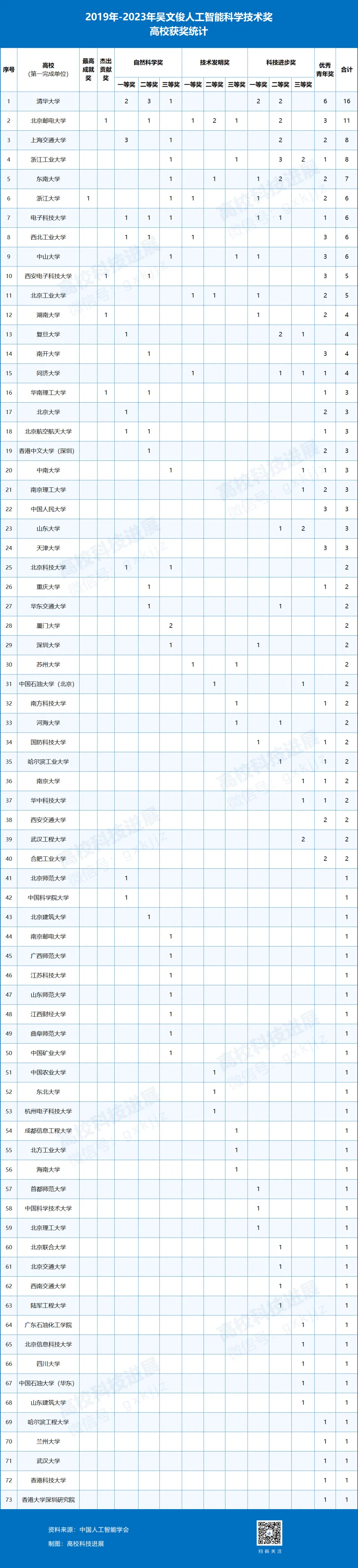 中國工程院院士、浙江大學計算機學院潘云鶴教授獲得2021年度第十一屆吳文俊人工智能最高成就獎;2019年~2023年期間,北京郵電大學、西安電子科技大學、湖南大學、華南理工大學均有1項摘得吳文俊人工智能杰出貢獻獎。