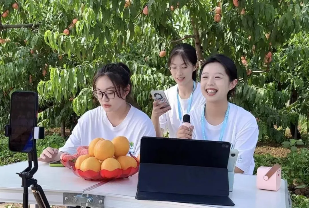 北京財(cái)貿(mào)職業(yè)學(xué)院學(xué)生在劉家店鎮(zhèn)松棚村開展大桃直播帶貨活動(dòng)
