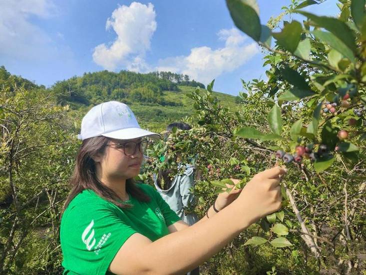實踐團成員在藍莓種植基地采摘藍莓,陳怡馨供圖