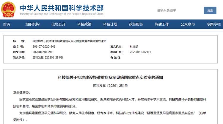 科技部關(guān)于批準(zhǔn)建設(shè)疑難重癥及罕見病國家重點(diǎn)實驗室的通知