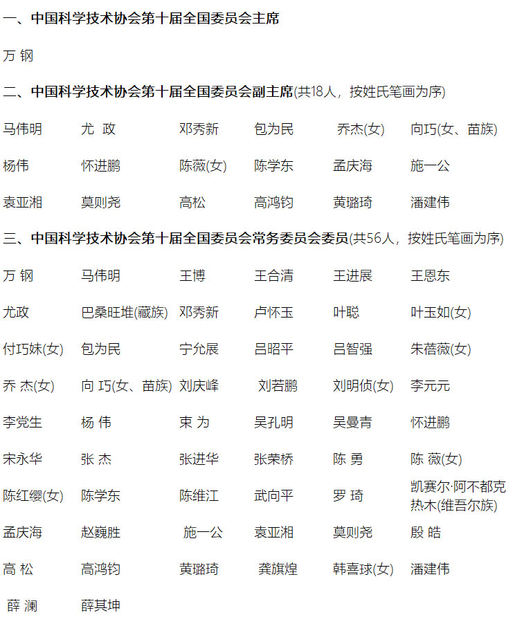 中國科學(xué)技術(shù)協(xié)會第十屆全國委員會主席、副主席、常務(wù)委員名單