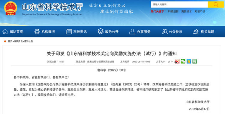 近年來(lái),山東省持續(xù)深化科技獎(jiǎng)勵(lì)制度改革,2018年出臺(tái)《山東省深化科技獎(jiǎng)勵(lì)制度改革實(shí)施方案》,2020年出臺(tái)《山東省科學(xué)技術(shù)進(jìn)步獎(jiǎng)產(chǎn)業(yè)突出貢獻(xiàn)類項(xiàng)目管理辦法》,在全國(guó)率先開展科技獎(jiǎng)勵(lì)“懸賞制”改革,對(duì)市場(chǎng)份額高、引領(lǐng)行業(yè)發(fā)展成果按程序直接授予省科技進(jìn)步一等獎(jiǎng)。山東省科技獎(jiǎng)勵(lì)改革得到社會(huì)各界特別是科技界充分肯定,2021年11月,科技部等十部門聯(lián)合印發(fā)《關(guān)于組織開展科技成果評(píng)價(jià)改革試點(diǎn)工作的通知》,明確山東省作為全國(guó)唯一省份開展科技獎(jiǎng)勵(lì)改革試點(diǎn)。