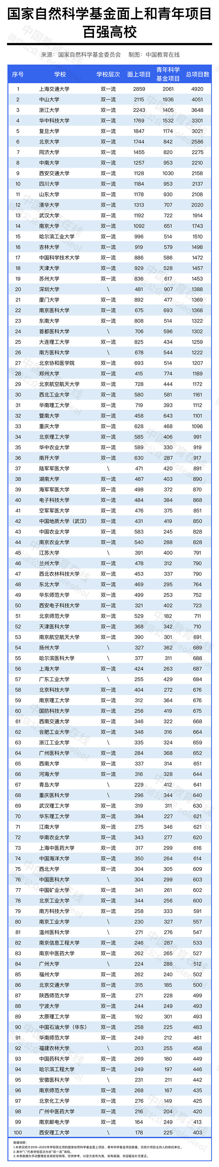 除重量級(jí)項(xiàng)目和人才項(xiàng)目之外,面上項(xiàng)目和一般青年科學(xué)基金項(xiàng)目也是國(guó)家自科基金的重要組成部分,是資助數(shù)量最多的兩個(gè)項(xiàng)目。本文對(duì)2016-2020年高校獲批國(guó)家自科基金面上和青年項(xiàng)目進(jìn)行了統(tǒng)計(jì),包含國(guó)家自然科學(xué)基金面上項(xiàng)目和國(guó)家自然科學(xué)基金青年科學(xué)基金項(xiàng)目,僅統(tǒng)計(jì)項(xiàng)目主持人的依托單位。