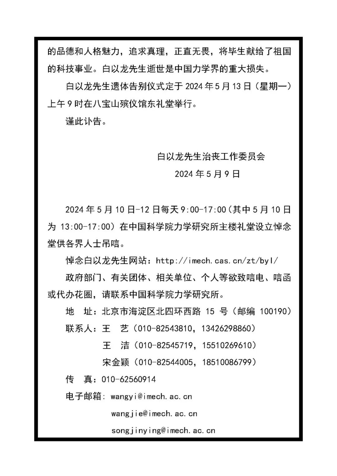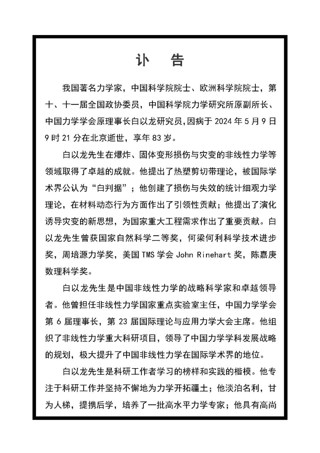 中國科學院力學所5月9日發(fā)布訃告:中國著名力學家,中國科學院院士、歐洲科學院院士,第十、十一屆全國政協(xié)委員,中國科學院力學研究所原副所長、中國力學學會原理事長白以龍研究員,因病于當天上午在北京逝世,享年83歲。