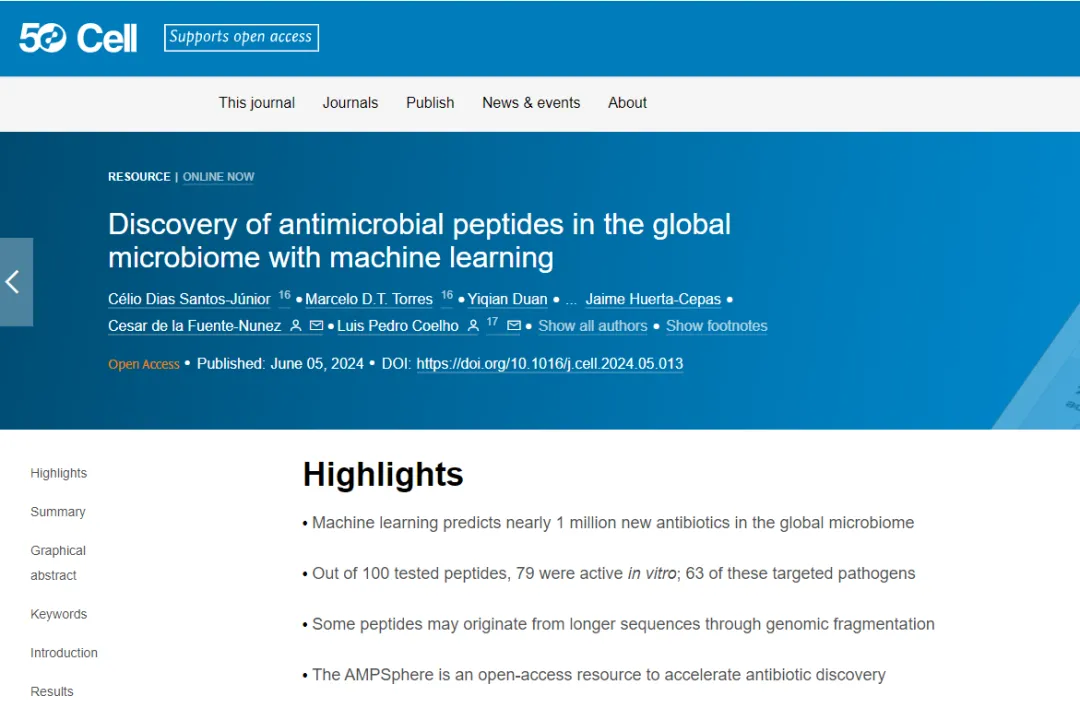 近日,復(fù)旦大學(xué)類腦智能科學(xué)與技術(shù)研究院(下文簡稱“類腦研究院”)青年研究員路易斯·佩德羅·科埃略(Luis Pedro Coelho)、名譽(yù)教授皮爾·伯克(Peer Bork)、特聘教授趙興明團(tuán)隊(duì)與來自美國與德國的科學(xué)家將人工智能與生物醫(yī)學(xué)交叉融合,從全球微生物組中預(yù)測近100萬種新型抗菌肽。相關(guān)成果以《利用機(jī)器學(xué)習(xí)發(fā)現(xiàn)全球微生物組中的抗菌肽》(“Discovery of antimicrobial peptides in the global microbiome with machine learning”)為題,在《細(xì)胞》(Cell)主刊上發(fā)表。