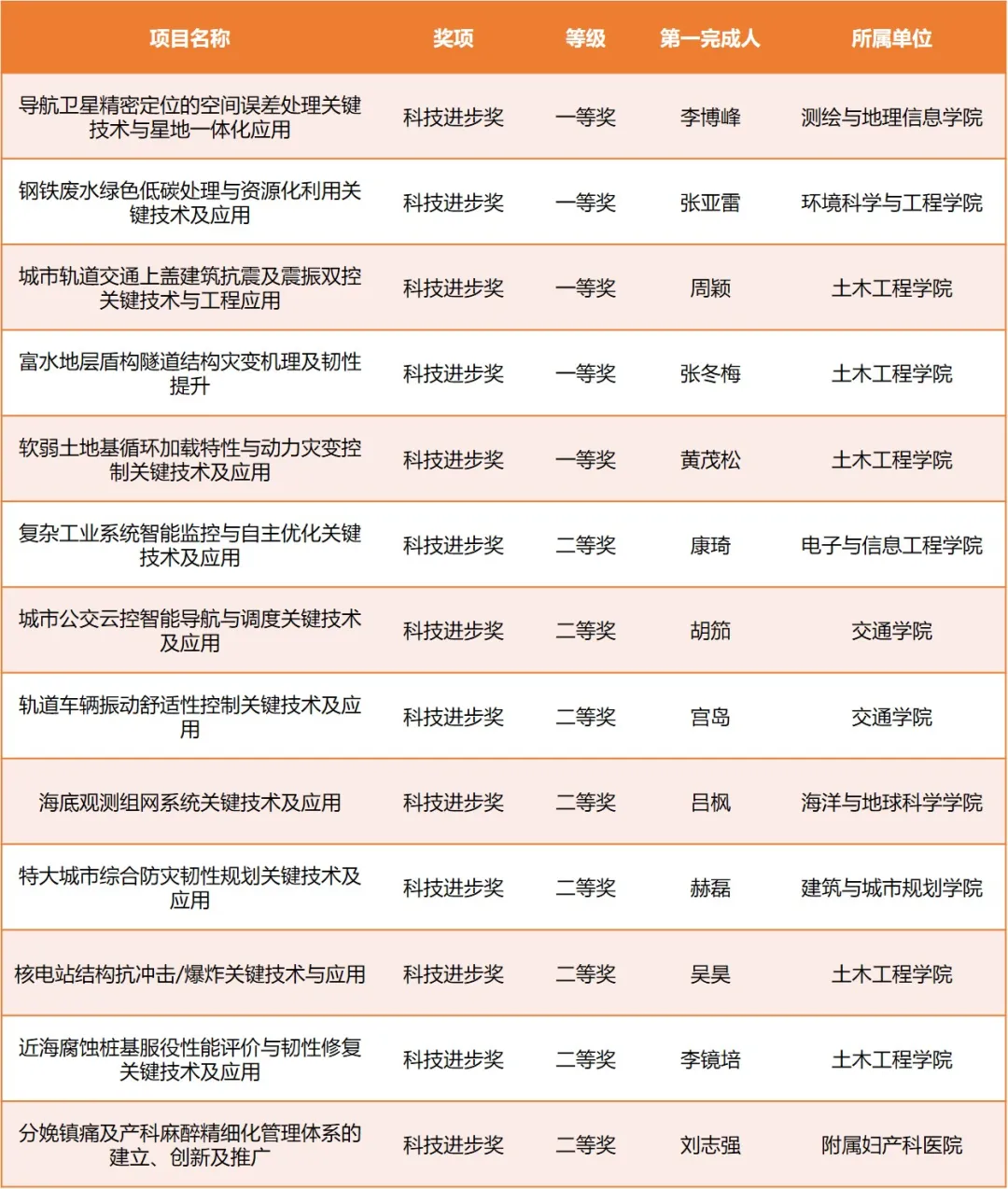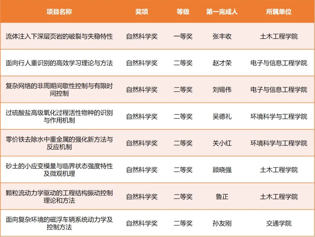 獲科技進(jìn)步獎(jiǎng)13項(xiàng),其中一等獎(jiǎng)5項(xiàng),分別是測(cè)繪與地理信息學(xué)院李博峰主持完成的“導(dǎo)航衛(wèi)星精密定位的空間誤差處理關(guān)鍵技術(shù)與星地一體化應(yīng)用”、環(huán)境科學(xué)與工程學(xué)院張亞雷主持完成的“鋼鐵廢水綠色低碳處理與資源化利用關(guān)鍵技術(shù)及應(yīng)用”、土木工程學(xué)院周穎主持完成的“城市軌道交通上蓋建筑抗震及震振雙控關(guān)鍵技術(shù)與工程應(yīng)用”、土木工程學(xué)院張冬梅主持完成的“富水地層盾構(gòu)隧道結(jié)構(gòu)災(zāi)變機(jī)理及韌性提升”、土木工程學(xué)院黃茂松主持完成的“軟弱土地基循環(huán)加載特性與動(dòng)力災(zāi)變控制關(guān)鍵技術(shù)及應(yīng)用”。