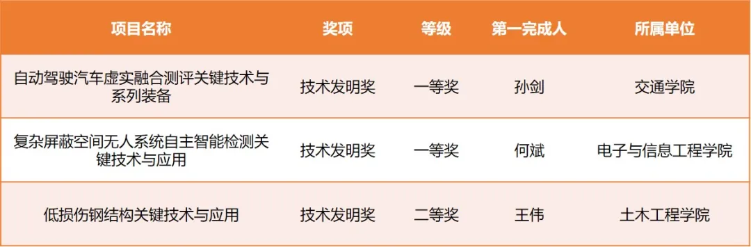 獲技術(shù)發(fā)明獎(jiǎng)3項(xiàng),其中一等獎(jiǎng)2項(xiàng),分別是交通學(xué)院孫劍主持完成的“自動(dòng)駕駛汽車虛實(shí)融合測(cè)評(píng)關(guān)鍵技術(shù)與系列裝備”、電子與信息工程學(xué)院何斌主持完成的“復(fù)雜屏蔽空間無(wú)人系統(tǒng)自主智能檢測(cè)關(guān)鍵技術(shù)與應(yīng)用”。