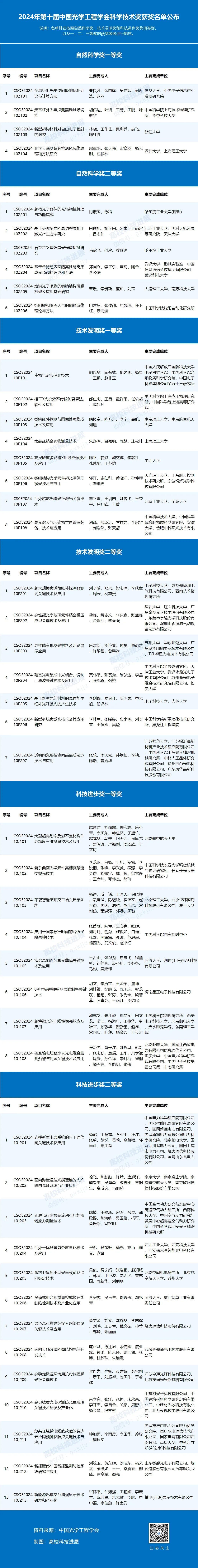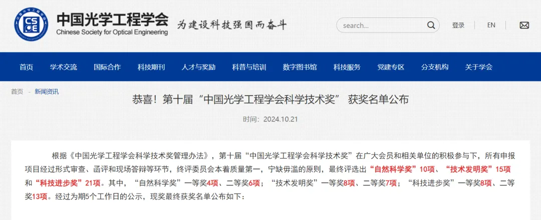 日前,2024年第十屆中國光學(xué)工程學(xué)會科學(xué)技術(shù)獎獲獎名單正式公布,最終評選出“自然科學(xué)獎”10項、“技術(shù)發(fā)明獎”15項和“科技進(jìn)步獎”21項。其中,“自然科學(xué)獎”一等獎4項、二等獎6項;“技術(shù)發(fā)明獎”一等獎8項、二等獎7項;“科技進(jìn)步獎”一等獎8項、二等獎13項。