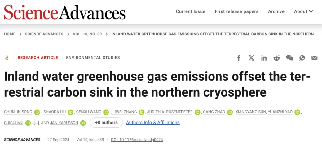 近日,四川大學水利水電學院/山區(qū)河流保護與治理全國重點實驗室王根緒研究員/宋春林副研究員團隊聯(lián)合國內外學者在國際綜合性期刊Science Advances發(fā)表題為“Inland water greenhouse gas emissions offset the terrestrial carbon sink in the northern cryosphere”的研究論文,首次評估北半球冰凍圈內陸水體溫室氣體排放通量和格局并探討了其對于陸地生態(tài)系統(tǒng)碳匯的抵消作用。