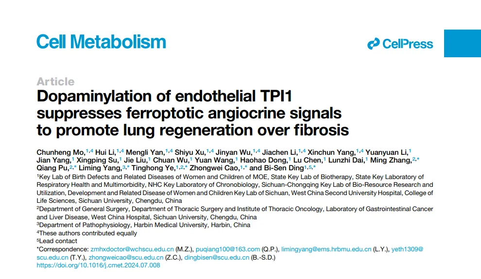 丁楅森/曹中煒團隊聯(lián)合國內相關領域科研人員在Cell Metabolism發(fā)表了題為“Dopaminylation of endothelial TPI1 suppresses ferroptotic angiocrine signals to promote lung regeneration over fibrosis”的研究論文。該研究通過整合點擊化學、蛋白組學、結構生物學、基因敲除/敲入鼠、臨床分析等多學科手段,發(fā)現(xiàn)多巴胺通過修飾肺血管TPI1調控Angiocrine因子,抑制鐵死亡從而促進肺再生并抑制纖維化。