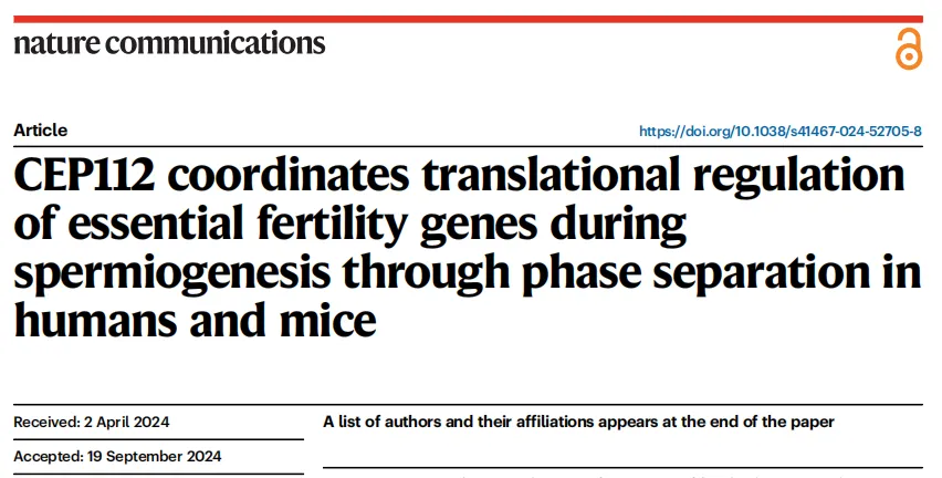 近日,華西二院生殖遺傳與表觀遺傳實驗室許文明團隊和中信湘雅生殖與遺傳專科醫(yī)院譚躍球團隊合作在Nature Communications上發(fā)表了題為CEP112 Coordinates Translational Regulation of Essential Fertility Genes During Spermiogenesis Through Phase Separation in Humans and Mice的研究論文。這項研究揭示了中心體蛋白112(CEP112)在精子形成過程中的關鍵作用,并為男性不育的分子機制提供了新的見解。
