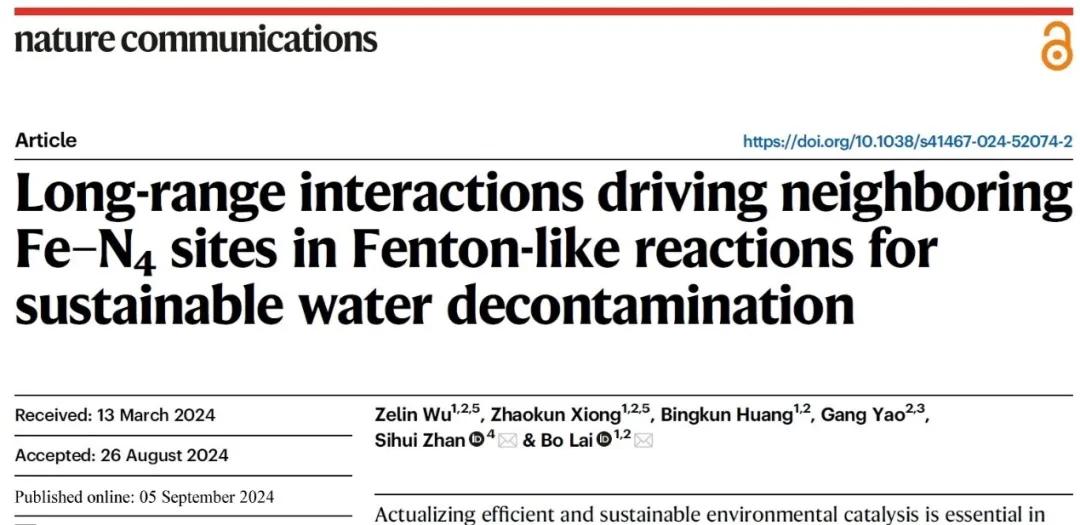 近日,四川大學建筑與環(huán)境學院賴波/熊兆錕團隊在Nature Communications在線發(fā)表了題為“Long-range interactions driving neighboring Fe–N4sites in Fenton-like reactions for sustainable water decontamination”的研究論文。四川大學建筑與環(huán)境學院博士研究生吳澤林和熊兆錕副研究員為論文共同第一作者,四川大學賴波教授和南開大學展思輝教授為論文共同通訊作者。四川大學建筑與環(huán)境學院為論文第一和通訊作者單位。