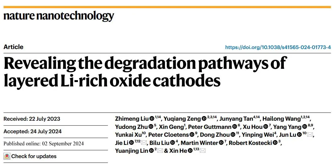 近日,四川大學化學工程學院何欣研究員團隊在國際期刊Nature Nanotechnology上發(fā)表題為Revealing the degradation pathways of layered Li-rich oxide cathodes的研究文章。通過整合形貌、結構和從單個原子的氧化態(tài)演化到次級顆粒的分析,經過納米尺度到微尺度的表征,確定了與顆粒內非相反應相關的不同結構變化途徑。