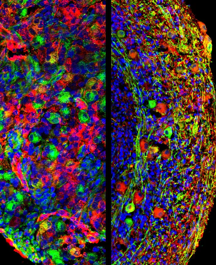 圖為人類背根結(jié)節(jié)(左)和人類背根結(jié)節(jié)類器官(右)的細(xì)胞組成對比圖。(受訪者供圖)