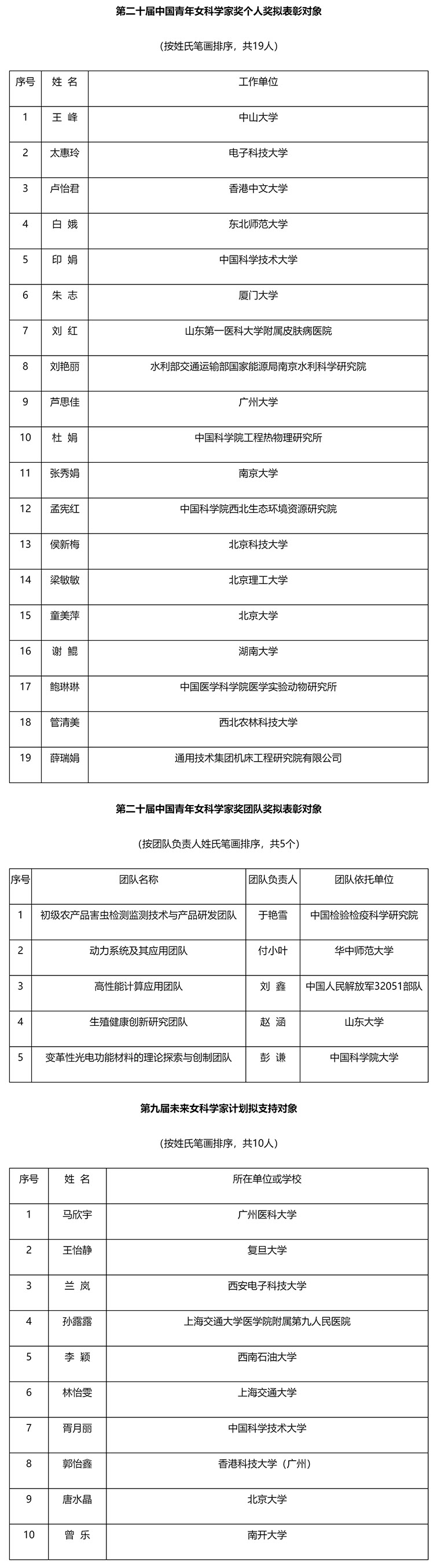 第二十屆中國青年女科學(xué)家獎(jiǎng)擬表彰對(duì)象名單公示