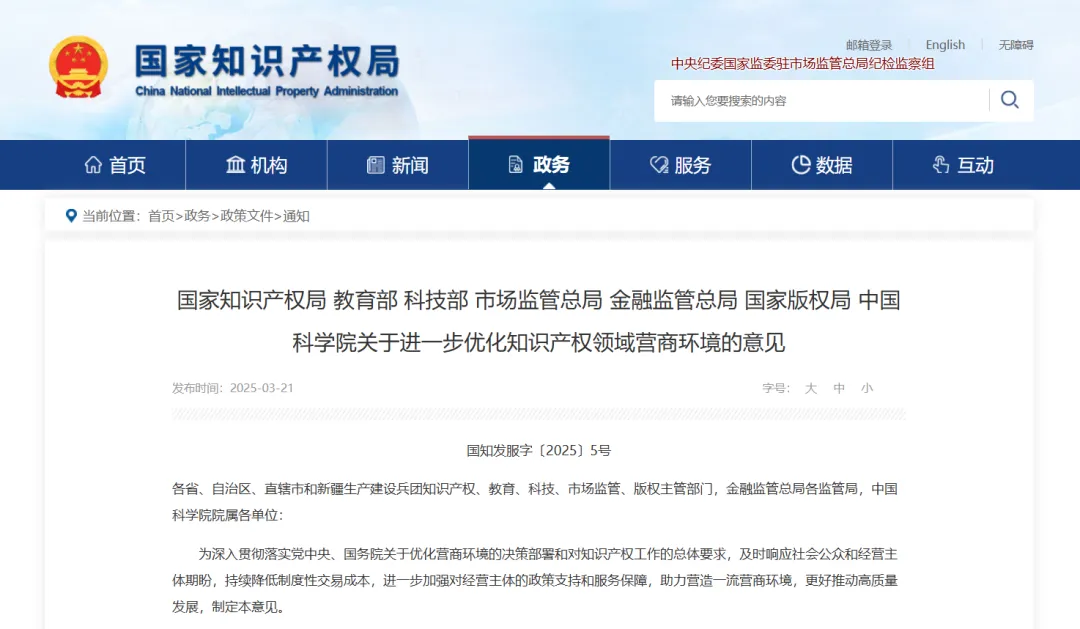 國家知識產(chǎn)權局 教育部 科技部 市場監(jiān)管總局 金融監(jiān)管總局 國家版權局 中國科學院關于進一步優(yōu)化知識產(chǎn)權領域營商環(huán)境的意見