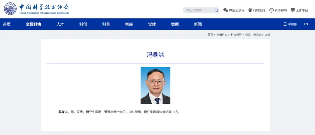 5月21日,據(jù)中國科學(xué)技術(shù)協(xié)會官網(wǎng)顯示,馮身洪已任中國科協(xié)黨組副書記。