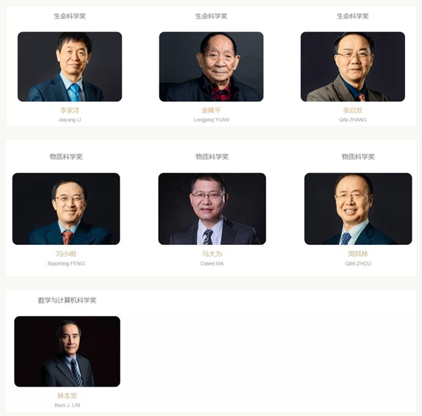 張亭棟、王振義獲得“生命科學(xué)獎”;盧柯獲得“物質(zhì)科學(xué)獎”;彭實戈獲得數(shù)學(xué)與計算機科學(xué)獎。