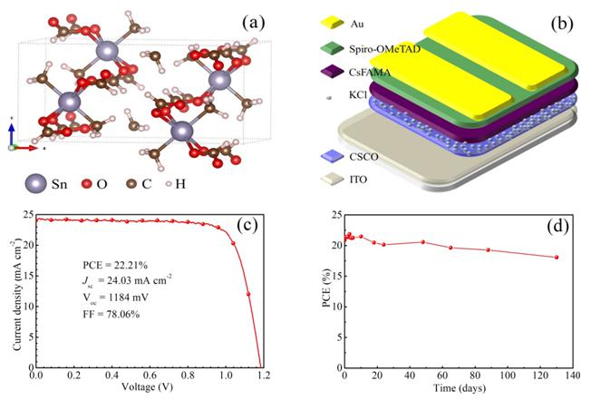 圖1. (a) CSCO分子結(jié)構(gòu)圖,(b) 鈣鈦礦太陽能電池結(jié)構(gòu),(c) 最優(yōu)化電池電流-電壓曲線,(d) 電池性能穩(wěn)定性。