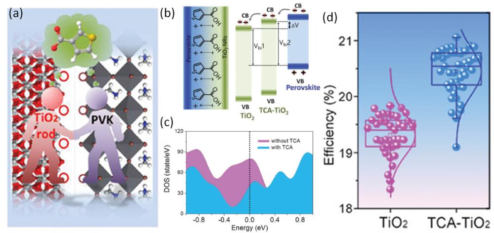 圖2. (a) 二氧化鈦/鈣鈦礦界面示意圖,(b) TCA分子偶極矩與界面能級(jí)搭配,(c) 界面處費(fèi)米能級(jí)附近態(tài)密度,(d) TCA偶聯(lián)前后器件效率對(duì)比