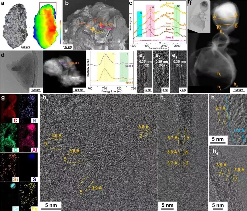 圖1 CE-5月壤樣品中天然石墨烯的先進電子顯微結構表征和譜學分析