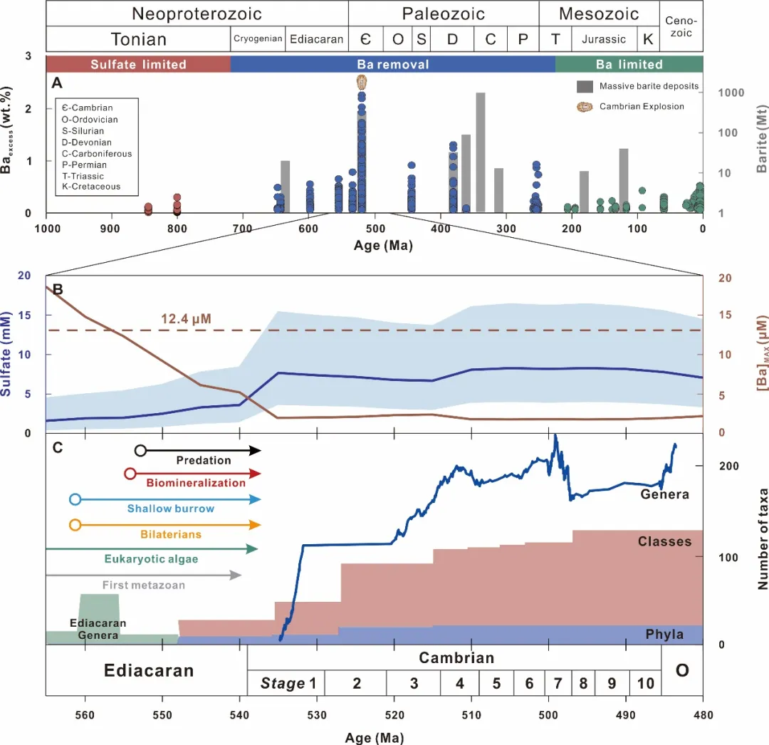 近期,衛(wèi)煒等人通過揚(yáng)子板塊下寒武統(tǒng)富金屬頁巖的鋇同位素?cái)?shù)據(jù)發(fā)現(xiàn),埃迪卡拉紀(jì)-寒武紀(jì)過渡時(shí)期海洋的逐漸氧化提升了硫酸根濃度,導(dǎo)致此前累積的溶解鋇離子以重晶石形式被大量移除。水體中高濃度的鋇會抑制水生動物的存活率,因此,對動物有毒害作用的硫化物和鋇離子的移除,改善了海洋的宜居性,促使了寒武紀(jì)生命大爆發(fā)。