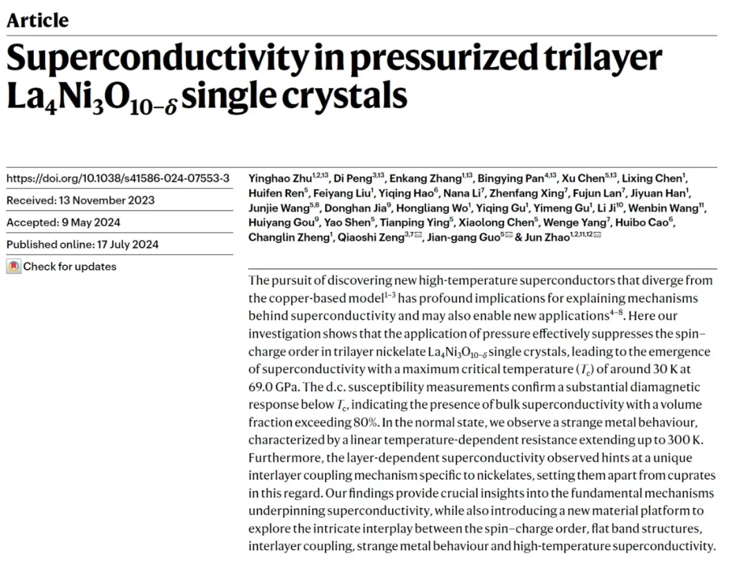 北京時間7月17日晚,該研究成果以“Superconductivity in pressurized trilayer La4Ni3O10-δ single crystals”為題發(fā)表于最新一期的《自然》(Nature)上。Nature同期在“新聞和觀點”(News&Views)專欄以“The search for superconductivity widens”為題對該文進行亮點推薦和介紹。