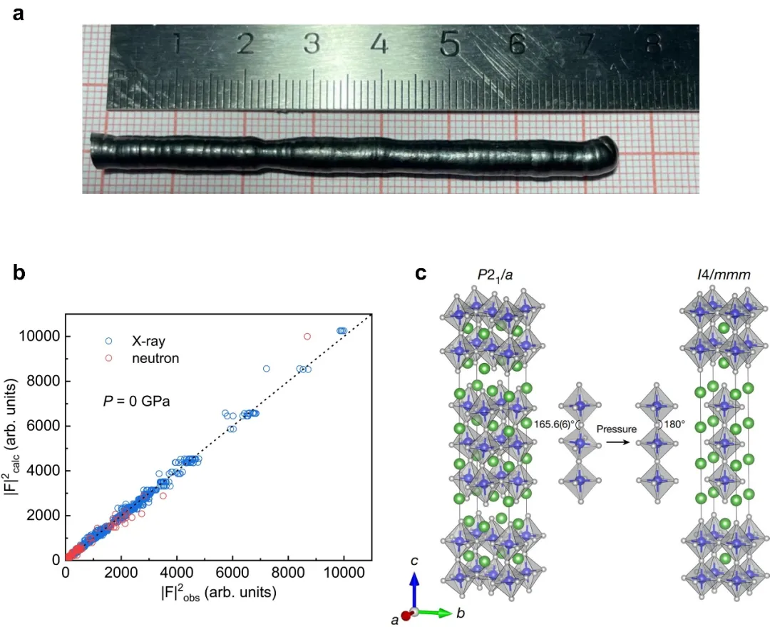 (a)La4Ni3O10-δ單晶樣品照片;(b)中子和X-ray單晶衍射數據;(c)壓力下晶格結構的演變
