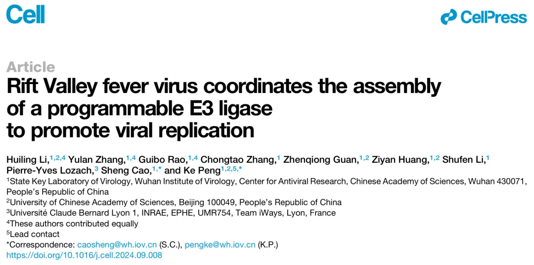 近日,中國科學(xué)院大學(xué)(以下簡稱“國科大”)博士生導(dǎo)師、中國科學(xué)院武漢病毒研究所(以下簡稱“武漢病毒所”)研究員彭珂、曹晟團隊在Cell上發(fā)表了題為“Rift Valley fever virus coordinates the assembly of a programmable E3-ligase to promote viral replication”的研究論文。該研究揭示了裂谷熱病毒非結(jié)構(gòu)蛋白NSs重塑宿主E3泛素連接酶系統(tǒng)性抑制宿主抗病毒免疫的致病新機制。國科大2021級生物化學(xué)與分子生物學(xué)專業(yè)博士生李慧玲,武漢病毒所實驗師張玉蘭、饒桂波為共同第一作者。
