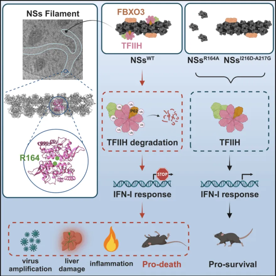 文章模式圖:NSs蛋白重塑的FBXO3-NSs filament介導(dǎo)TFIIH復(fù)合體降解,系統(tǒng)性拮抗宿主IFN-I反應(yīng),促進RVFV感染致病