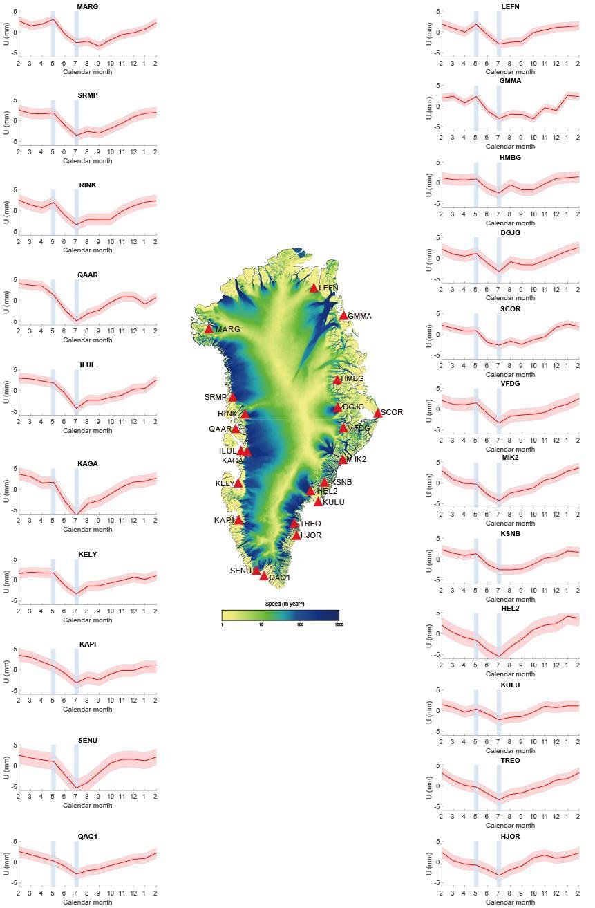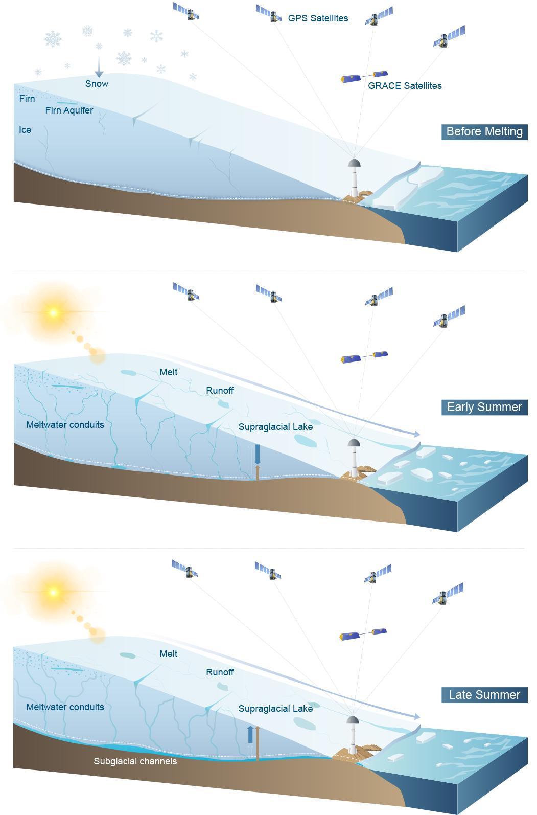 近日,南方科技大學(xué)地球與空間科學(xué)系冉將軍副教授課題組與國(guó)際團(tuán)隊(duì)合作,在研究冰川融化機(jī)制方面取得新進(jìn)展。研究團(tuán)隊(duì)利用全球衛(wèi)星導(dǎo)航系統(tǒng)首次揭示了融水在格陵蘭冰蓋內(nèi)部和底部的演化(圖1),相關(guān)成果以“Vertical bedrock shifts reveal summer water storage in Greenland ice sheet”為題發(fā)表在頂級(jí)學(xué)術(shù)期刊《自然》(Nature)上。