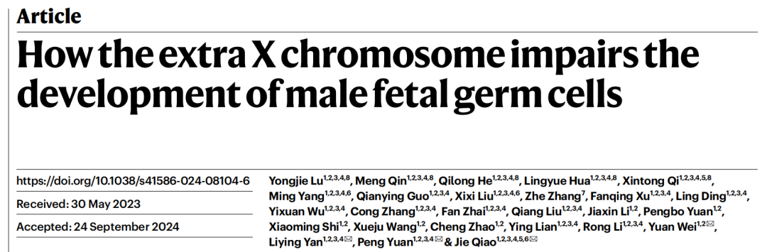 2024年10月30日,北京大學(xué)第三醫(yī)院婦產(chǎn)科喬杰/袁鵬/閆麗盈/魏瑗團(tuán)隊(duì)合作在《自然》(Nature)發(fā)表了題為“How the extra X chromosome impairs the development of male fetal germ cells(額外的X染色體如何損害男性胎兒生殖細(xì)胞發(fā)育)”的研究文章。