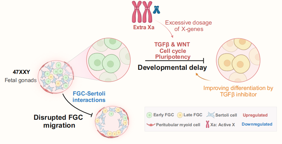 該研究以導(dǎo)致男性不育最常見的性染色體疾病——克氏綜合征(核型47,XXY)為代表,系統(tǒng)揭示了額外的X染色體導(dǎo)致男性胎兒生殖細(xì)胞(Fetal germ cell, FGC)發(fā)育異常的分子機(jī)制,并且發(fā)現(xiàn)了改善該類患者生殖障礙的潛在干預(yù)策略,為其不育癥的早期治療提供了理論依據(jù)。