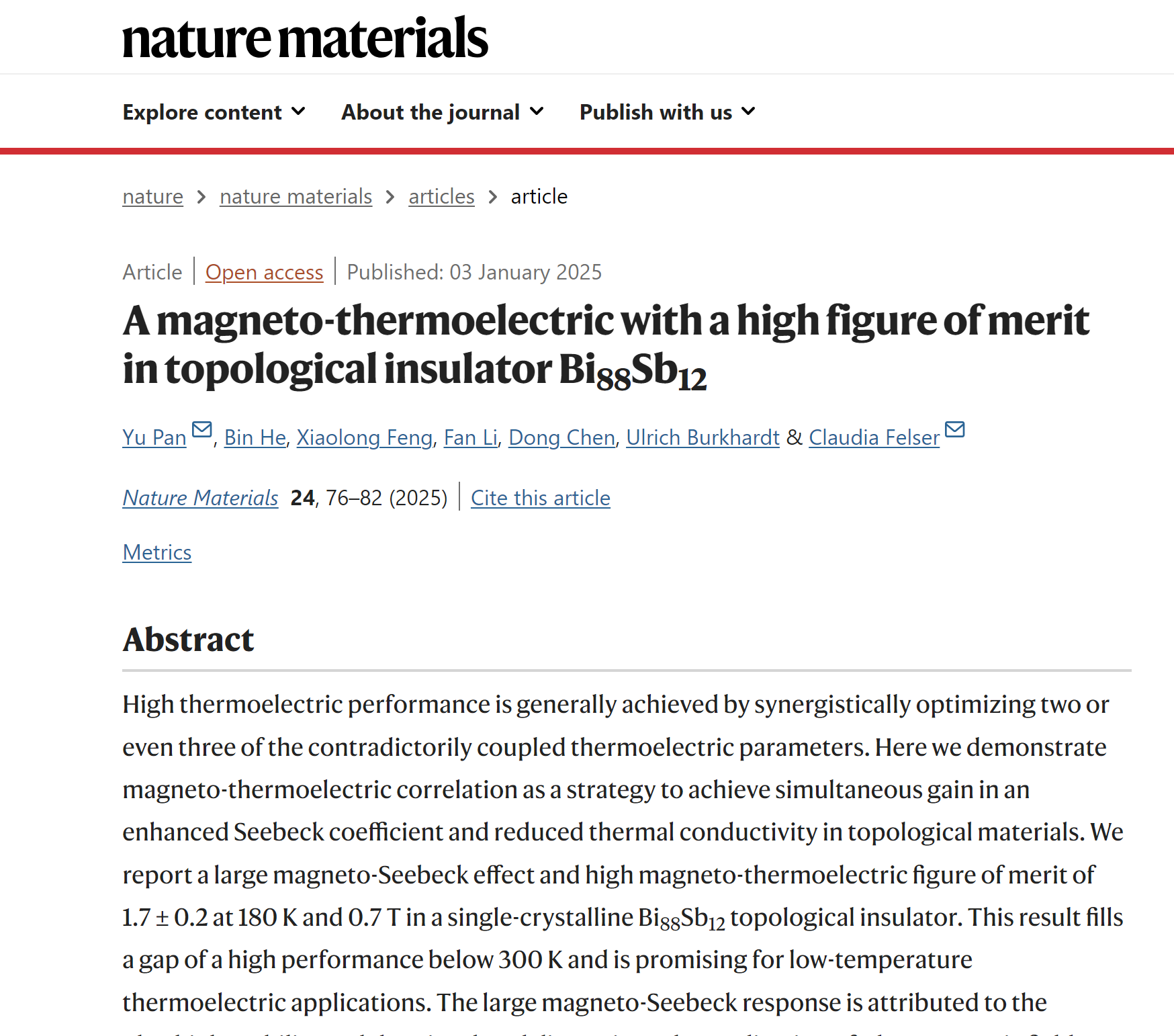 北京時(shí)間2025年1月3日,重慶大學(xué)前沿交叉學(xué)科研究院量子材料與器件研究中心、材料科學(xué)與工程學(xué)院潘瑜教授在國際頂級(jí)期刊《自然材料》(Nature Materials)發(fā)表最新研究成果。論文題目為《具有優(yōu)異磁-熱電優(yōu)值的Bi88Sb12拓?fù)浣^緣體》(A magneto-thermoelectric with a high figure of merit in topological insulator Bi88Sb12 )。潘瑜教授為第一作者、通訊作者,重慶大學(xué)為第二完成單位、通訊單位,德國馬普固體化學(xué)物理研究所為第一完成單位,合作單位還包括馬普微結(jié)構(gòu)物理研究所、重慶大學(xué)物理學(xué)院。