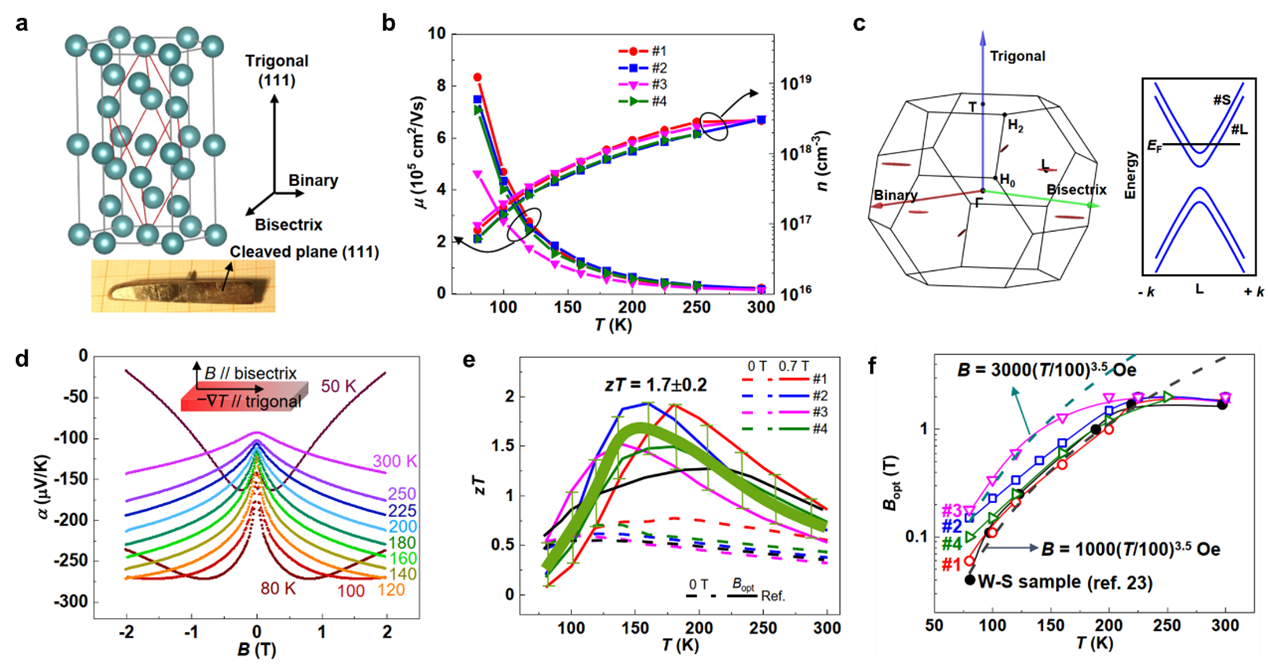 圖1 (a) 晶體結(jié)構(gòu)與單晶照片,(b)遷移率與載流子濃度,(c)費(fèi)米面分布與能帶劈裂示意圖,(d)磁-塞貝克系數(shù),(e)zT值,(f)最佳磁場(chǎng)與溫度的依賴關(guān)系。