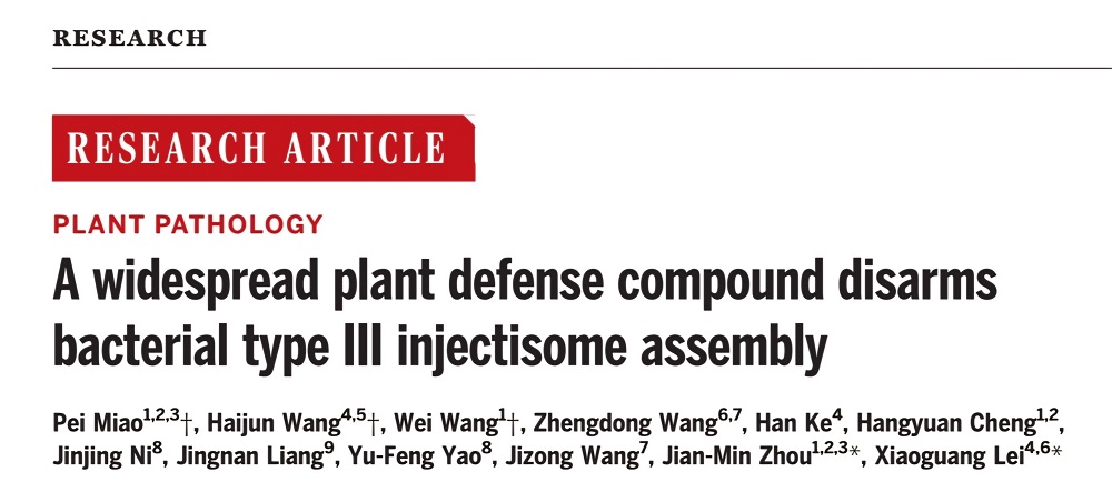 2025年2月28日,北京大學(xué)化學(xué)與分子工程學(xué)院/北大-清華生命科學(xué)聯(lián)合中心雷曉光教授團(tuán)隊聯(lián)合中國科學(xué)院遺傳發(fā)育所/崖州灣國家實驗室周儉民研究員團(tuán)隊在Science上發(fā)表了題為“A widespread plant defense compound disarms bacterial type III injectisome assembly”的研究論文(Science 2025, 387, eads0377),首次揭示了一類植物內(nèi)源存在的、具有作用機(jī)制獨特、廣譜抗菌活性的天然產(chǎn)物分子——芥酸酰胺。研究表明,芥酸酰胺通過特異性破壞植物病原細(xì)菌的三型分泌系統(tǒng)(T3SS)組裝,有效抑制其致病力,從而實現(xiàn)對多種細(xì)菌侵染的廣譜抑制作用。這一機(jī)制體現(xiàn)了“不戰(zhàn)而屈人之兵”的創(chuàng)新抗菌策略,與傳統(tǒng)抗生素藥物相比具有顯著優(yōu)勢:芥酸酰胺不直接殺滅細(xì)菌,而是選擇性地降低病原菌的致病力,這種獨特的作用模式不僅確保了更高的生物安全性,還顯著減少了對環(huán)境的污染風(fēng)險,同時有效規(guī)避了細(xì)菌耐藥性的產(chǎn)生。這一重大科學(xué)發(fā)現(xiàn)為新型生物農(nóng)藥的研發(fā)開辟了全新路徑,對推動綠色農(nóng)業(yè)可持續(xù)發(fā)展具有重要的理論和實踐意義。