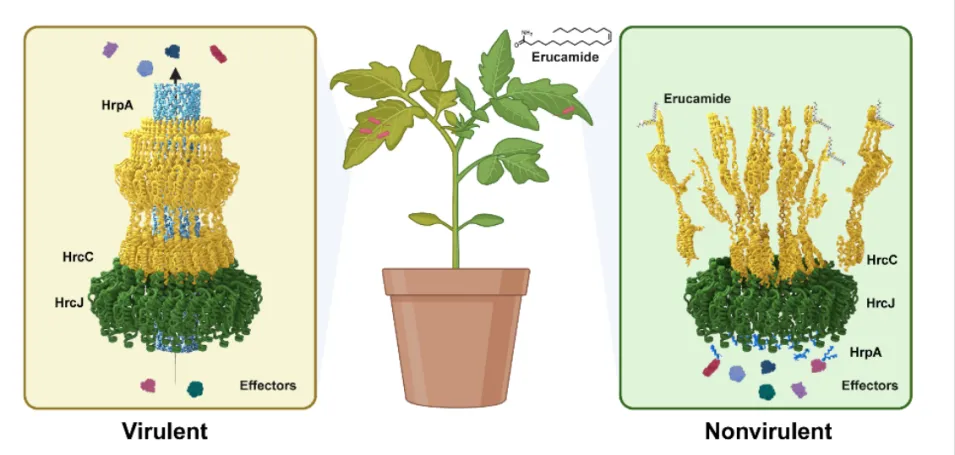 研究發(fā)現(xiàn),芥酸酰胺能夠靶向破壞病原細(xì)菌的關(guān)鍵致病裝置——三型分泌系統(tǒng)(Type III secretion system, T3SS)。T3SS是許多動植物病原細(xì)菌用于向宿主細(xì)胞分泌毒性效應(yīng)蛋白的核心裝置,對細(xì)菌致病性至關(guān)重要。通過遺傳學(xué)實驗,研究團(tuán)隊證實芥酸酰胺的積累是植物實現(xiàn)對病原細(xì)菌免疫的關(guān)鍵機(jī)制。進(jìn)一步的研究揭示,芥酸酰胺與T3SS的重要組分HrcC蛋白特異性結(jié)合,干擾其在病原細(xì)菌外膜上的正確定位,從而有效抑制T3SS的組裝,使病原細(xì)菌失去致病能力。