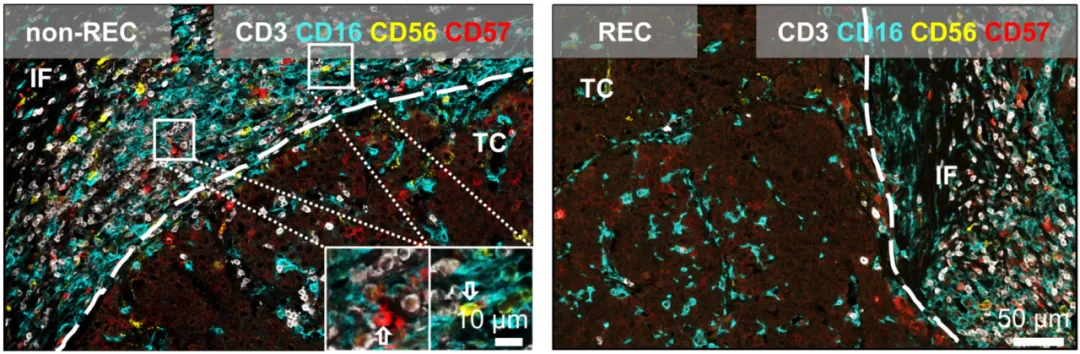 非復(fù)發(fā)(non-REC)和復(fù)發(fā)(REC)組織中的多色免疫組化染色。與復(fù)發(fā)肝癌相比,非復(fù)發(fā)肝癌患者的腫瘤侵襲前緣區(qū)域(invasive front)NK細(xì)胞更為豐富。