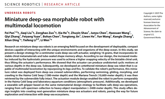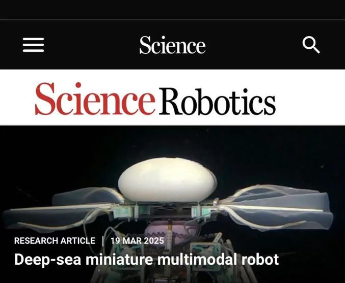 這一能在萬米深海實(shí)現(xiàn)多模態(tài)運(yùn)動(dòng)的小型深??勺冃螜C(jī)器人,由北京航空航天大學(xué)機(jī)械工程及自動(dòng)化學(xué)院研究團(tuán)隊(duì)聯(lián)合中科院深海所、浙江大學(xué)歷經(jīng)6年共同研發(fā),深海小型多模態(tài)機(jī)器人研究成果于3月20日發(fā)表在國際學(xué)術(shù)頂刊《科學(xué)·機(jī)器人》(Science Robotics),為深海探索帶來了更多可能性,成果同時(shí)被Science Robotics官網(wǎng)首頁大圖介紹。