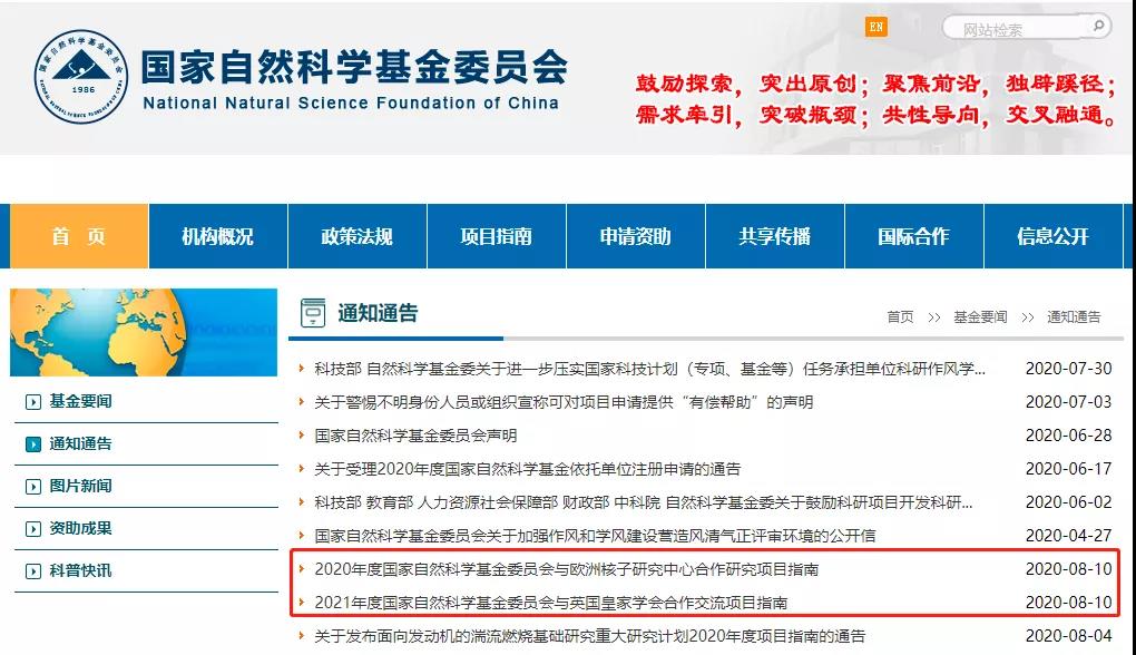 8月10日,國家自然科學(xué)基金委官網(wǎng)發(fā)布了2020年度與歐洲核子研究中心合作研究項(xiàng)目指南和2021年度與英國皇家學(xué)會合作交流項(xiàng)目指南。在最新發(fā)布的這兩批項(xiàng)目中,國家自然科學(xué)基金擬對與歐洲核子研究中心合作研究項(xiàng)目,給予單項(xiàng)最高1000萬元人民幣的直接費(fèi)用資助。