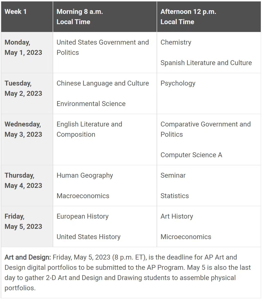 2023年大陸AP考試將在5月的兩周內(nèi)在學(xué)校進行:5月1-5日和5月8-12日,完整版AP考試時間表如下: