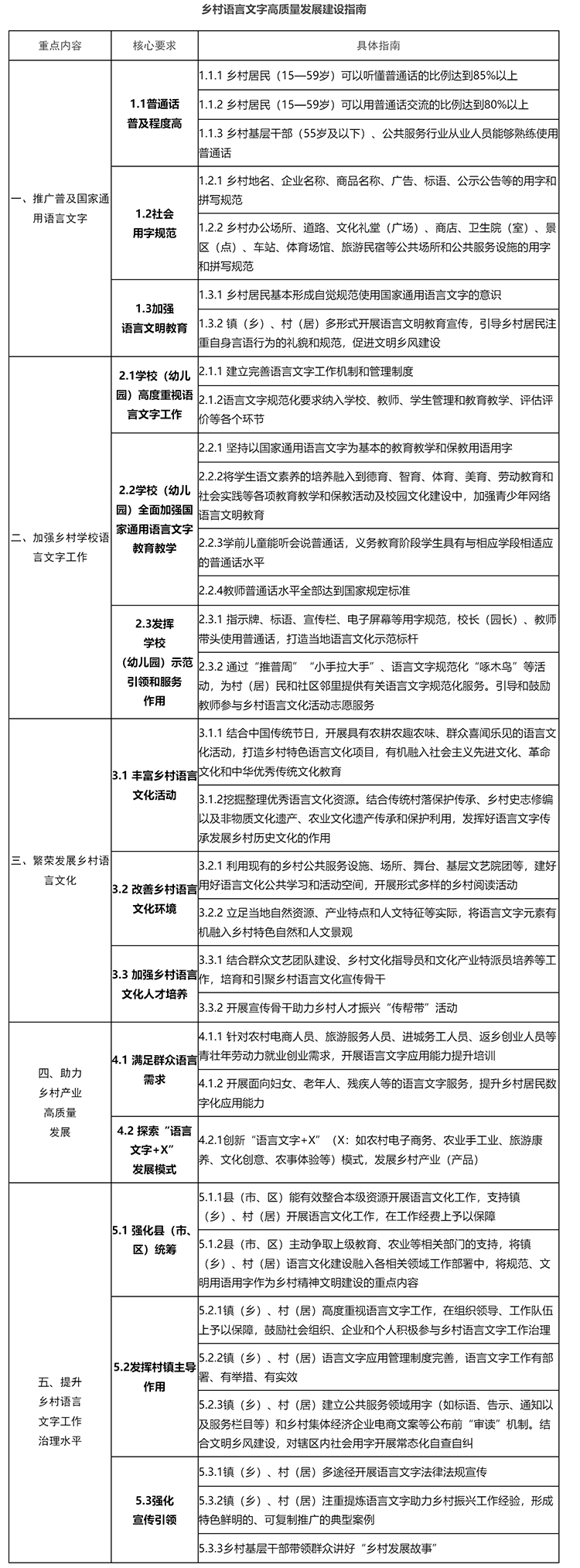 為深入學(xué)習(xí)貫徹習(xí)近平新時(shí)代中國特色社會(huì)主義思想,貫徹落實(shí)黨的二十大和二十屆二中、三中全會(huì)精神及全國教育大會(huì)精神,落實(shí)《教育強(qiáng)國建設(shè)規(guī)劃綱要(2024—2035年)》關(guān)于實(shí)施國家通用語言文字普及攻堅(jiān)和質(zhì)量提升行動(dòng)要求,學(xué)習(xí)運(yùn)用“千村示范、萬村整治”工程經(jīng)驗(yàn),引導(dǎo)鄉(xiāng)村規(guī)范使用國家通用語言文字、提高人民群眾語言文化素養(yǎng)、繁榮發(fā)展鄉(xiāng)村語言文化、賦能鄉(xiāng)村產(chǎn)業(yè)發(fā)展,教育部、農(nóng)業(yè)農(nóng)村部聯(lián)合研究制定了《鄉(xiāng)村語言文字高質(zhì)量發(fā)展建設(shè)指南》(以下簡稱《指南》),現(xiàn)印發(fā)給你們。有關(guān)工作要求如下。